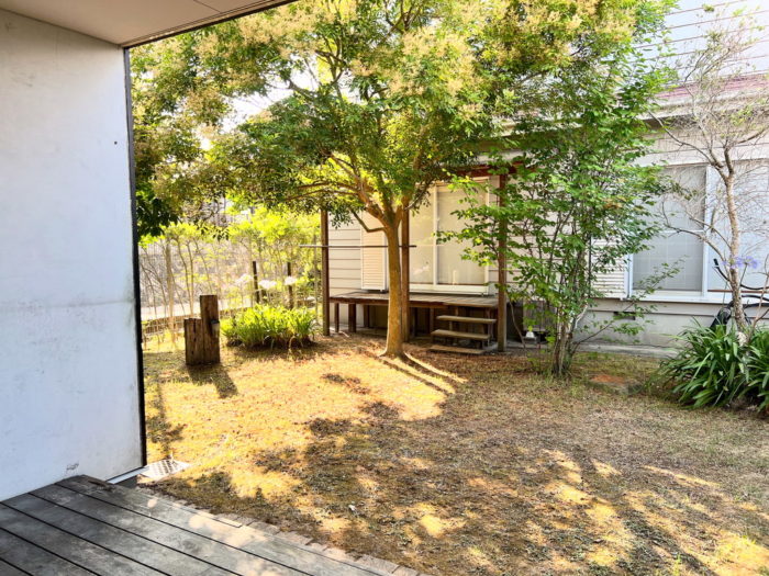 その間に囲まれた中庭で愛犬と一緒に、バーベキューやプールを楽しんでいました。